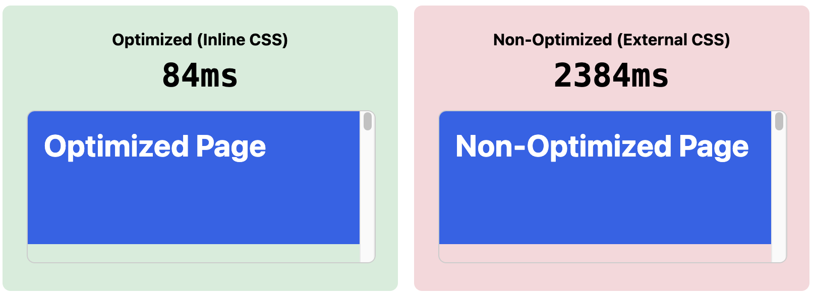 I set up two identical pages to measure this effect. Both have the same content and final appearance, but one inlines critical CSS while the other loads it externally.